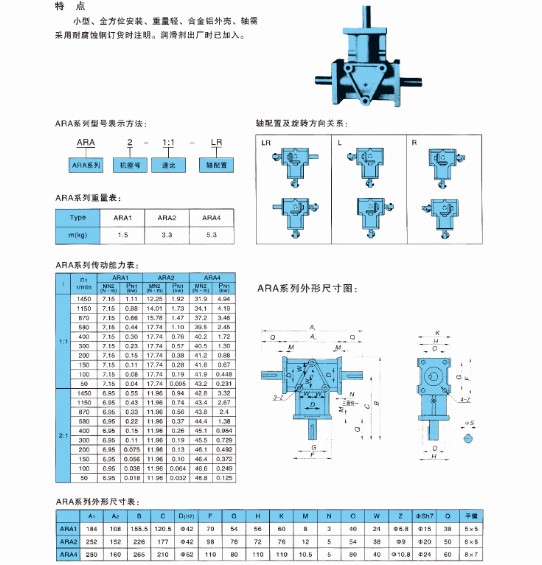 ARA轉(zhuǎn)向箱,標(biāo)準(zhǔn)化,多品種,速比1:1、1.5:1、2:1、3:1全部為實(shí)際傳動比。平均效率高達(dá)98%。