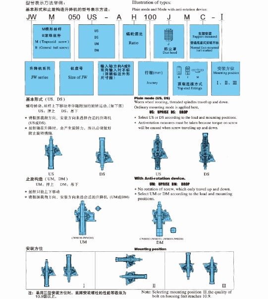 JWM絲桿升降機(jī)適用于低速低頻工況,廣泛應(yīng)用于機(jī)械、冶金、建筑、水利設(shè)備等行業(yè),具有起升、下降及借助輔件推進(jìn)、翻轉(zhuǎn)及各種高度位置調(diào)整等諸多功能。JWM蝸輪絲桿升降機(jī)是一種基礎(chǔ)起重部件,具有結(jié)構(gòu)緊湊、體積小、重量輕、動(dòng)力源廣泛、無(wú)噪音、安裝方便、使用靈活、功能多、配套形式多、可靠性高、使用壽命長(zhǎng)等許多優(yōu)點(diǎn)??梢詥闻_(tái)或組合使用,能按一定程序準(zhǔn)確地控制調(diào)整提升或推進(jìn)的高度,可以用電動(dòng)機(jī)或其它動(dòng)力直接帶動(dòng),也可以手動(dòng)。它有不同的結(jié)構(gòu)形式和裝配形式,且提升高度可按用戶的要求定制。